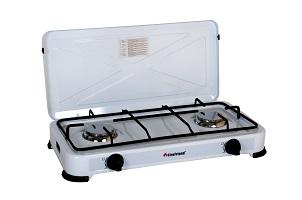 Zwei Feuerstellen, gutes Gerät, weil der Abstand der Flammen recht groß ist. Also kannst du für diese Feuerstelle 2 große Pfannen nehmen, also du kochst dann für 8 Personen, super, oder ? Wenn du das nach einiger Zeit gut kannst, dann kannst du damit deine Gäste enorm beeindrucken. Ein 2er Herd kostet ca. 80,00 €. Der Herd kann mit 2 Gasarten betrieben werden, Gas aus der Flasche oder aus der Leitung, dafür gibt es immer besondere Flammenspender, sind oft im Preis enthalten, leider NICHT IMMER.