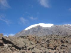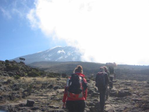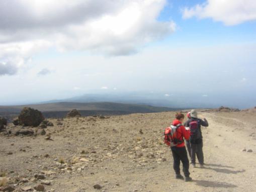 Vom Camp aus kann man die viel beschriebene Breakfastwall sehen, hier muß ausnahmsweise etwas geklettert werden, der Wall ist nicht besonders anstrengend. Die Landschaft entschädigt wie immer für die Mühen. Nach ca. 4 Stunden erreichen wir ein Plateau und dort gibt es ausnahmsweise warmes Mittagessen, anstatt Abendessen. Gut gestärkt und gelaunt nach Spaghetti Bolognaise und frischer Ananas geht es leicht aufwärts. Die Strecke zieht sich dahin, immer wieder erblickt man den Kibo mit seinen Gletschern, traumhaft und sehr respektabel, weiß nicht ob er bedrohlich oder einladend wirkt.