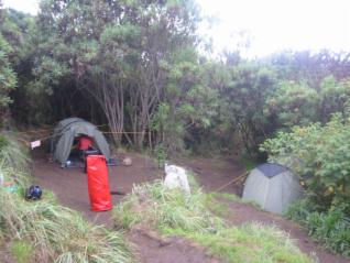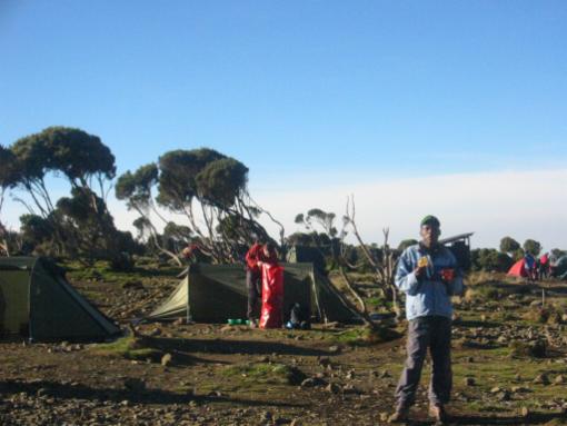 Nach anstrengender Wanderung erreichen wir endlich das Barrango Camp. Ich bin sehr müde und erkältet. Abends im Zelt ohne Licht suche ich lange Zeit meine verdammte Stirnlampe, kann sie aber nicht finden, mir ist eiskalt, muß an meine Familien denken, schlafe ein und habe furchtbare Alpträume, liege 2 Stunden wach und friere saumäßig, Gespräche aus dem Nachbarzelt machen mich nervös, Tiere, vielleicht Ratten, kratzen an meinem Zelt. Jetzt muß ich auch noch pinkeln, beim Aufstehen läuft mir die Teeflasche aus, fange urplötzlich an zu weinen, kurz aber heftig, dann ist alles urplötzlich wieder in Ordnung und kann 3 oder 4 Stunden etwas dösen. Denke an die Mühsal der Träger, an Reichtum in Deutschland, an Zufriedenheit im Allgemeinen. Durch die gesehene Armut in Moshi fange ich an zu überlegen ob man wirklich das alles braucht zum Glück was man zu Hause so besitzt und lange erkämpft, erarbeitet, ergattert und erstritten hat.